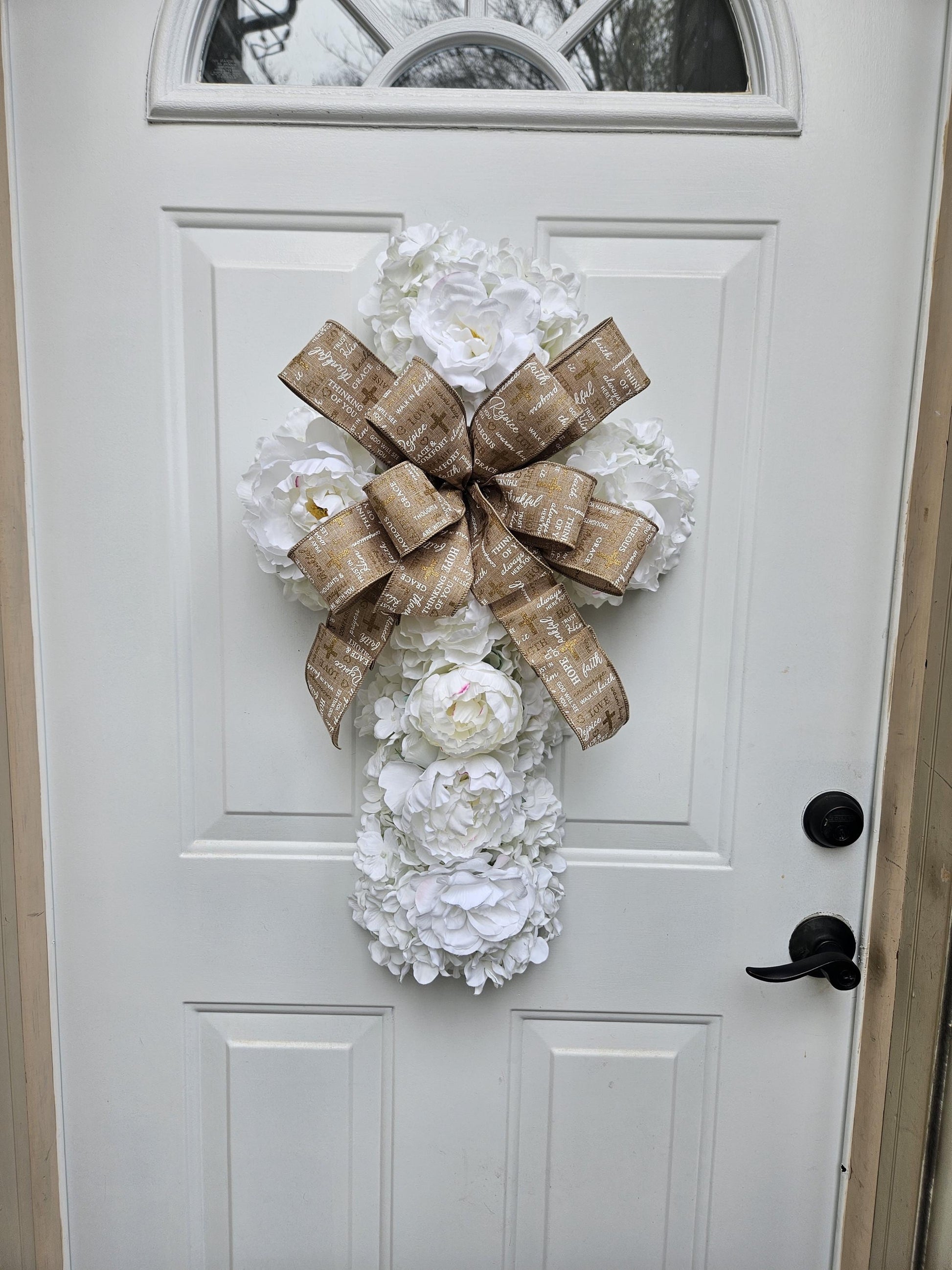 White floral cross wreath with gorgeous tan bow. Measuring approximately 28" x 18" x 7"