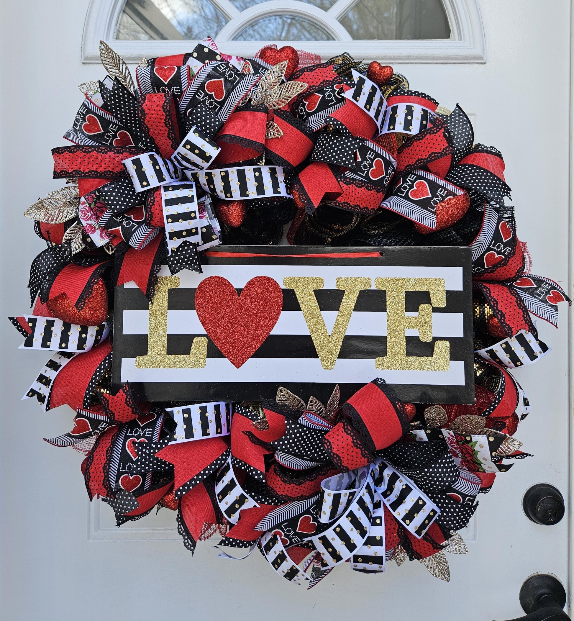 XL Valentine's Day Wreath, Love Wreath, Black, White, Red, and Gold